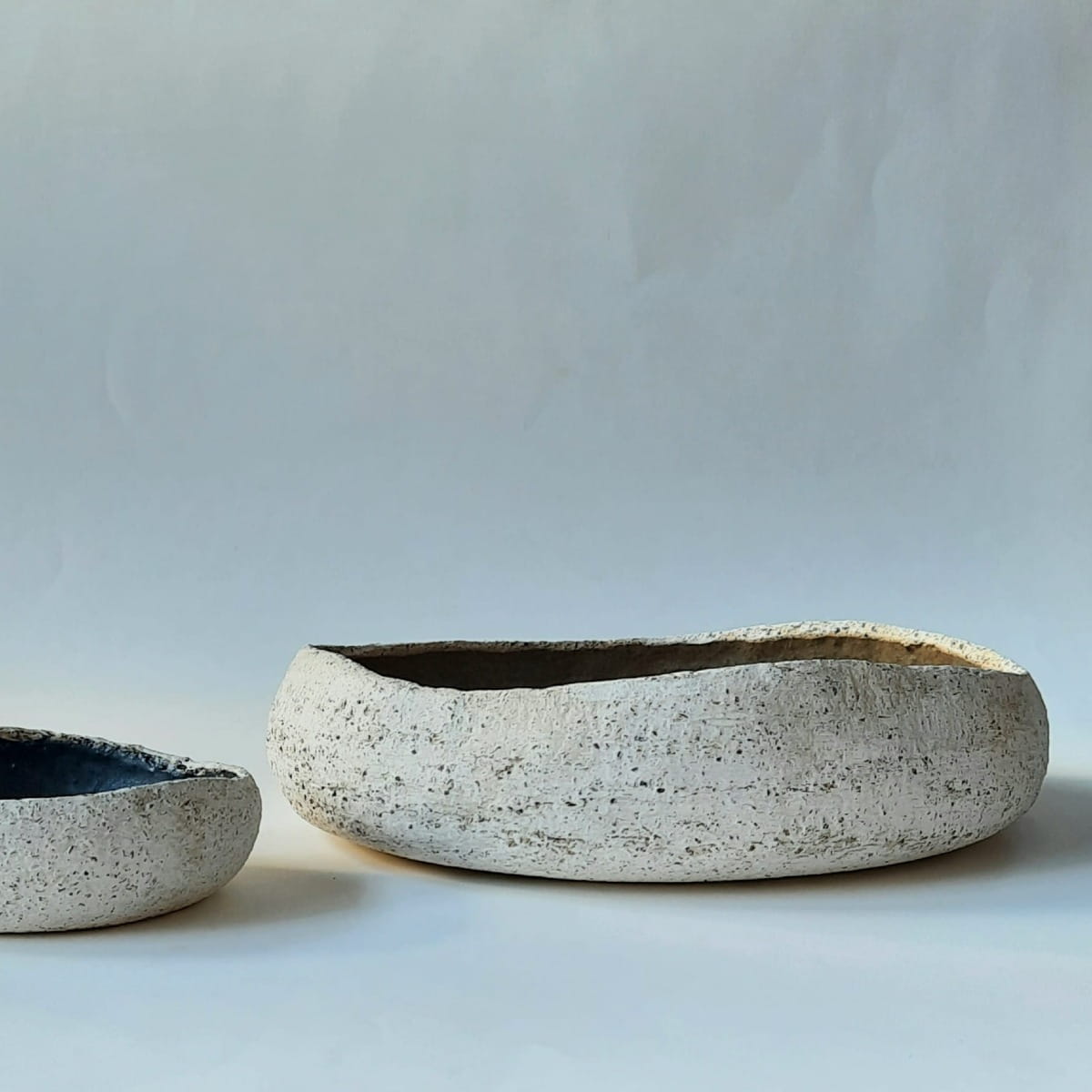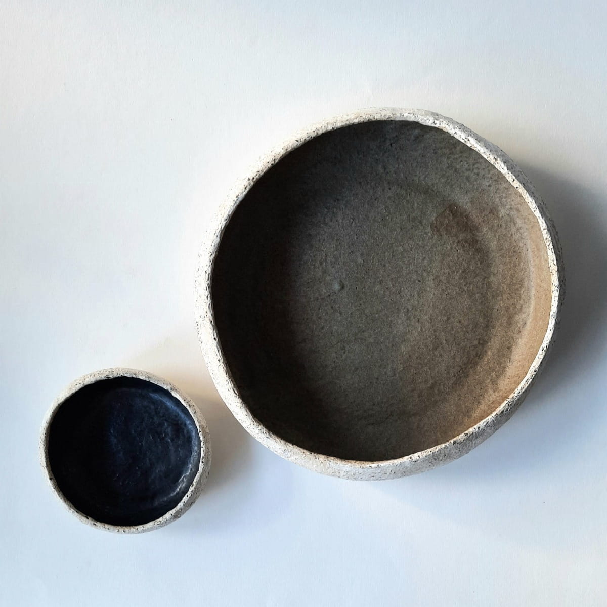Komplet dwóch ręcznie lepionych pater. Patery są niezwykle oryginalne i dekoracyjne. Na zewnątrz nieszkliwione, nieco surowe, przetarte bielą, z widoczną strukturą gliny. Duża patera została wewnątrz poszkliwiona kolorem delikatnego brązu, a mniejsza satynowym czarnym.
