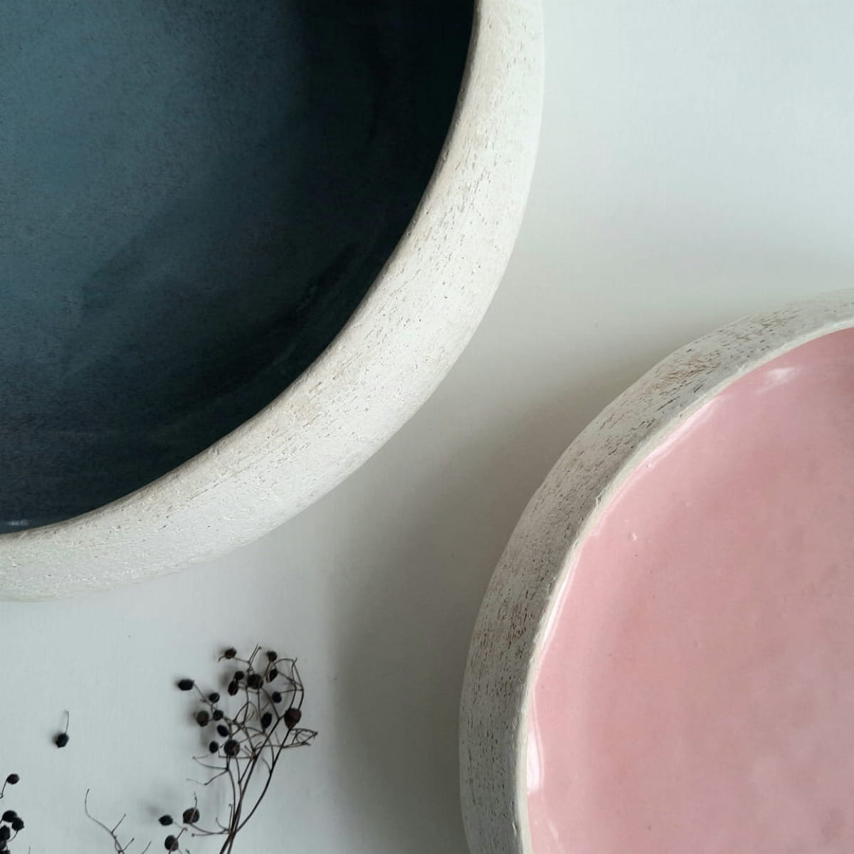 Komplet dwóch ręcznie lepionych pater. Patery są niezwykle oryginalne i dekoracyjne. Na zewnątrz nieszkliwione, nieco surowe, a jednak delikatne i subtelne. Przetarte bielą, z widoczną strukturą gliny. Kształt pater nieco zaokrąglony do wewnątrz. Mniejsza patera została wewnątrz poszkliwiona kolorem pudrowego różu, a większa przydymionym niebieskim.