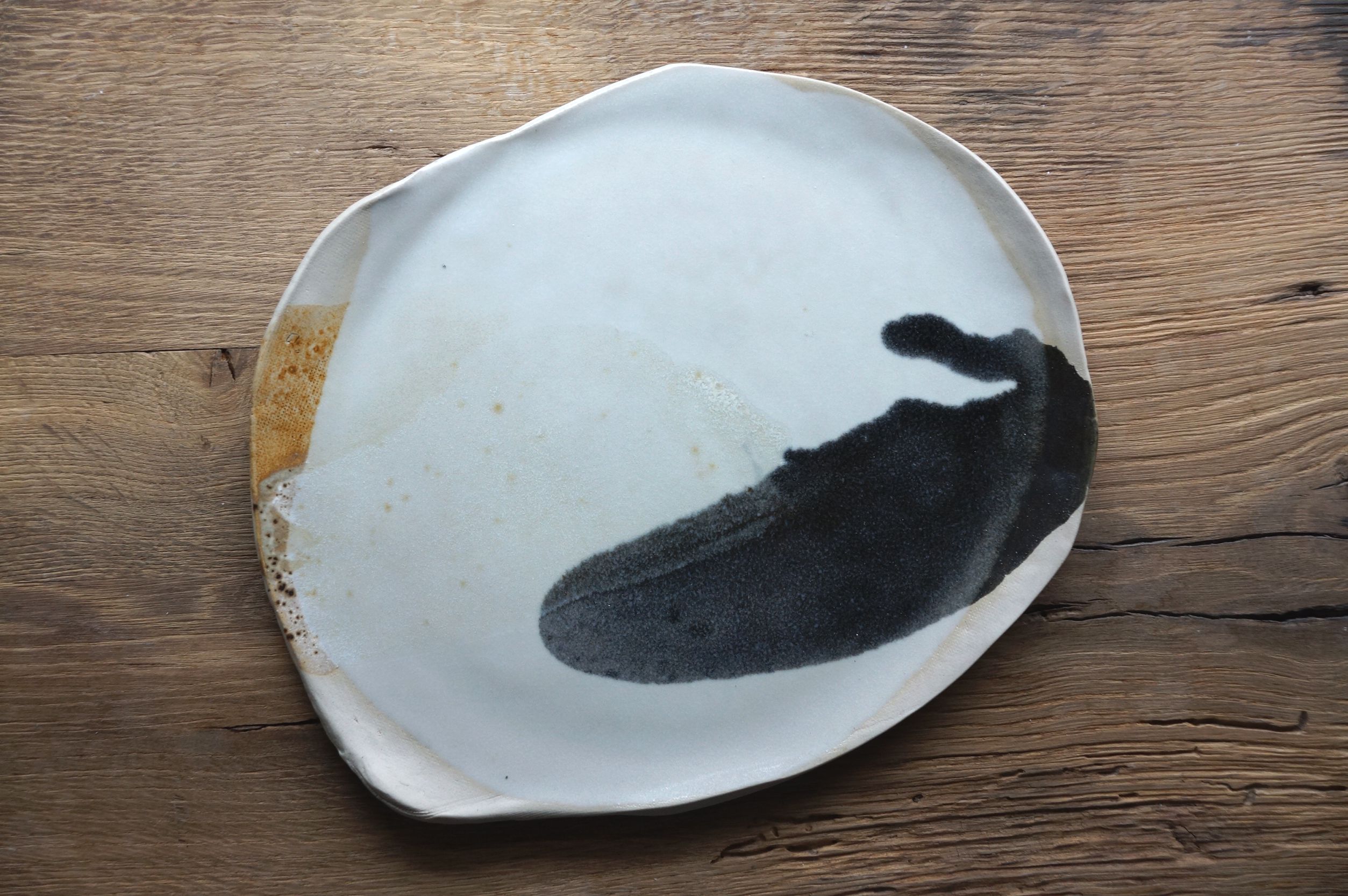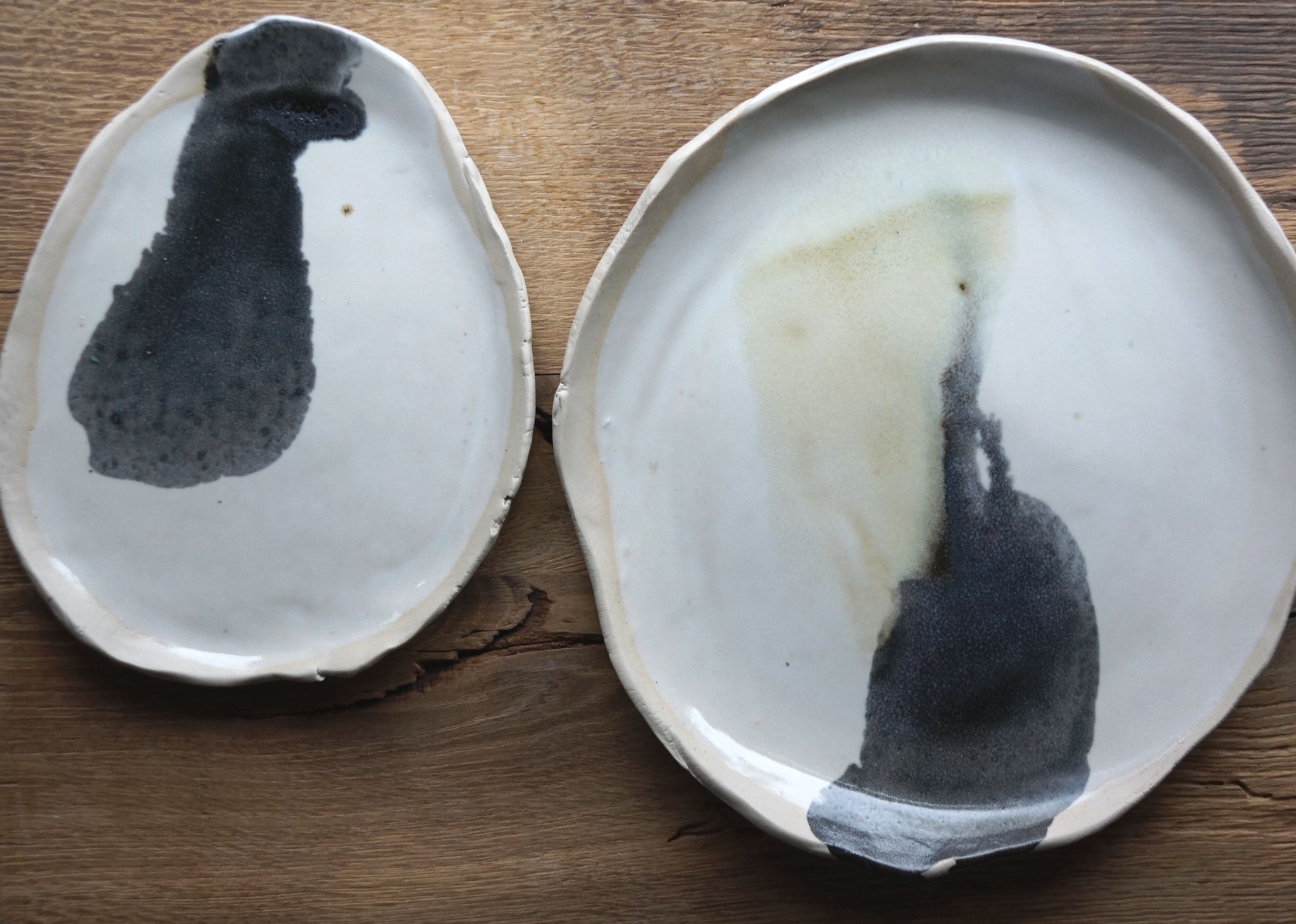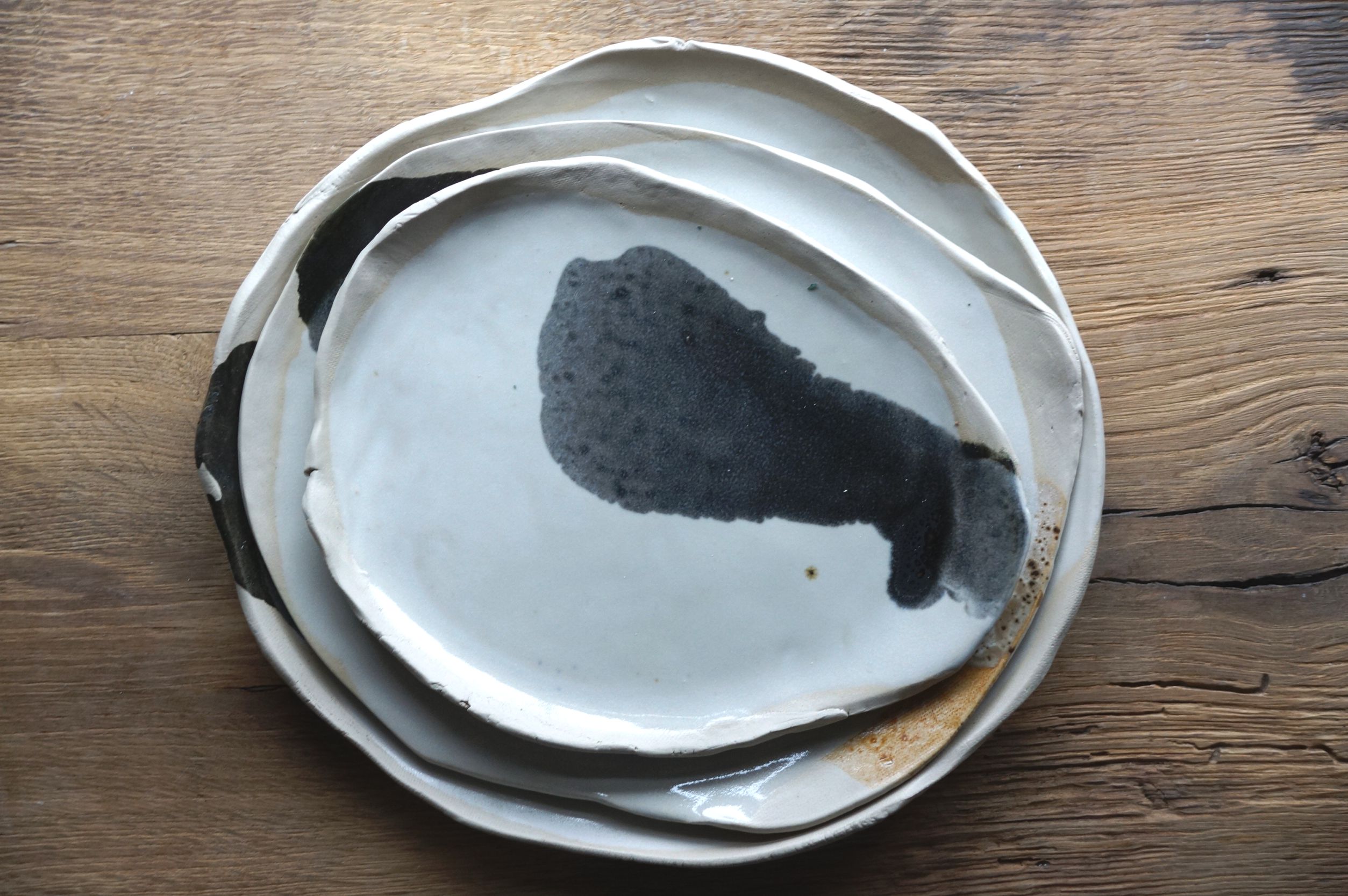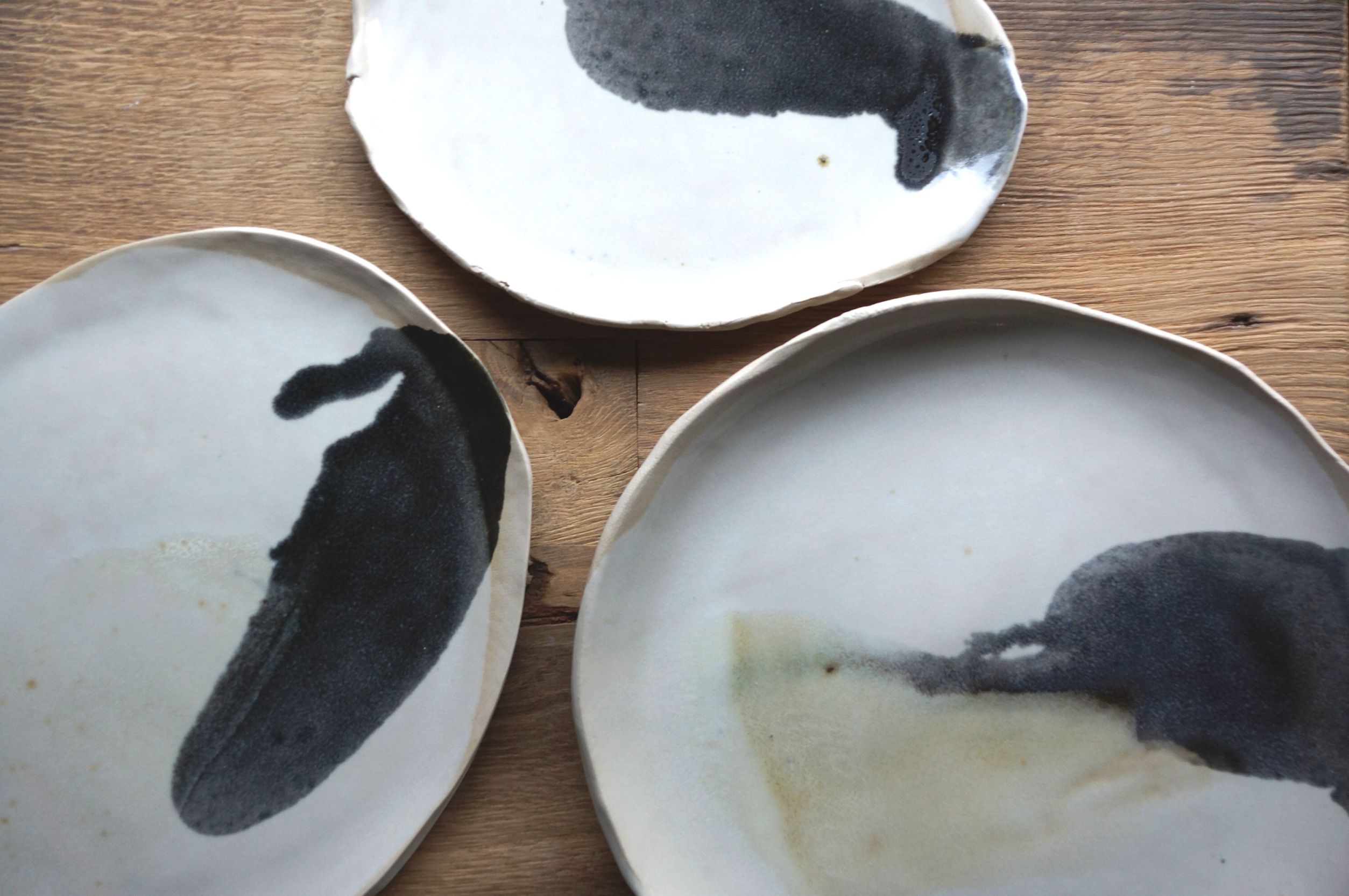 Komplet trzech niepowtarzalnych pater. Dominuje kolor biały, na którym czarny delikatnie rozlewa się tworząc niezwykłe efekty.